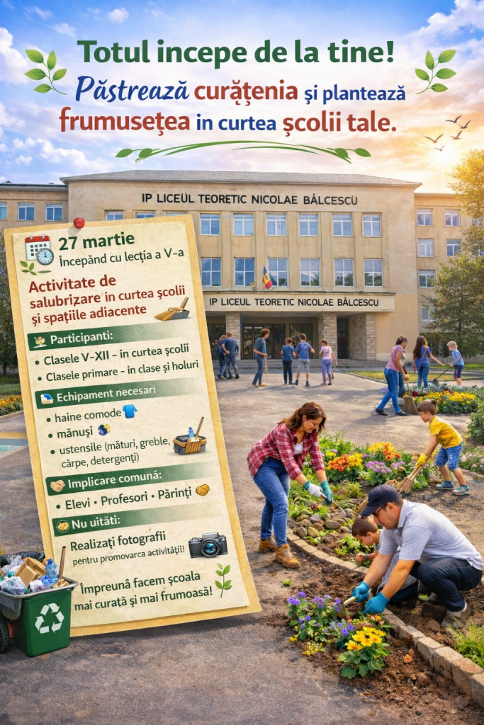 Vă invităm să ne implicăm cu toții în activitatea de salubrizare din 27 martie – o ocazie excelentă de a demonstra spiritul de echipă și de a cultiva responsabilitatea civică în rândul elevilor 🌱🤝